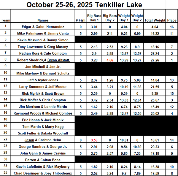 Tenkiller Lake Championship Results Oct 25/26 2025